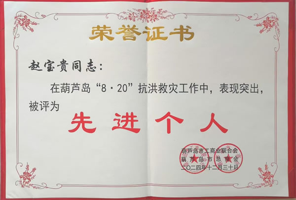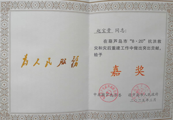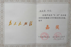 嘉獎(jiǎng):趙寶貴同志在葫蘆島市“8·20”抗洪救災(zāi)和災(zāi)后重建工作中做出突出貢獻(xiàn)