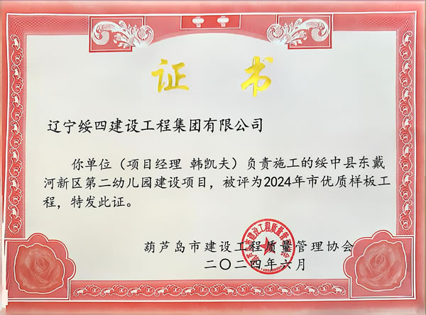 綏中縣東戴河新區(qū)第二幼兒園建設(shè)項(xiàng)目被評為2024年市優(yōu)質(zhì)樣板工程