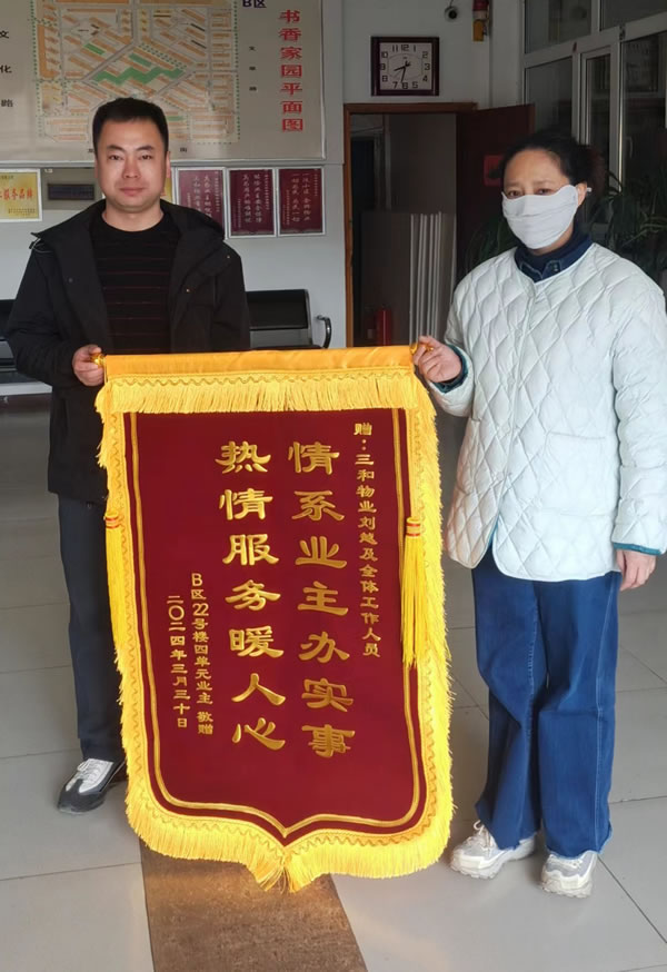近日,書香家園B區(qū)一業(yè)主親手將一面繡有“情系業(yè)主辦實(shí)事 熱情服務(wù)暖人心”的錦旗贈(zèng)送給三和物業(yè)團(tuán)隊(duì),以表達(dá)對(duì)他們?cè)谔幚硐滤蓝氯麊?wèn)題上所展現(xiàn)出的高效服務(wù)和專業(yè)務(wù)實(shí)態(tài)度的高度贊揚(yáng)與深深感謝。