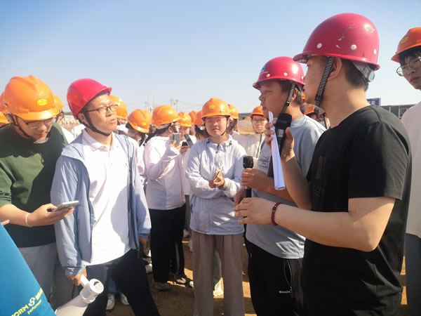 施工現(xiàn)場,于海部長向同學(xué)們詳細(xì)介紹了項目工程概況、工程進度、設(shè)計理念等內(nèi)容,段文博向同學(xué)們介紹了施工工藝和當(dāng)前土方回填、基礎(chǔ)施工等情況。參觀過程中對同學(xué)們提出的問題進行現(xiàn)場解答,確保理論與實踐融合,讓參觀學(xué)習(xí)走實又走心。