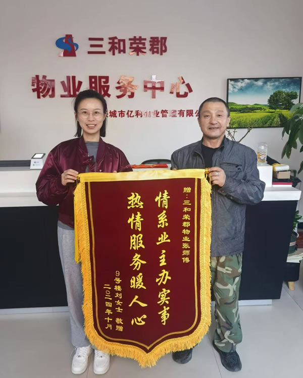10月25日,業(yè)主劉女士將一面繡有“情系業(yè)主辦實事 熱情服務暖人心”字樣的錦旗送到了三和榮郡物業(yè)服務中心,對維修師傅張興軍及時解決水管漏水問題表示感謝。