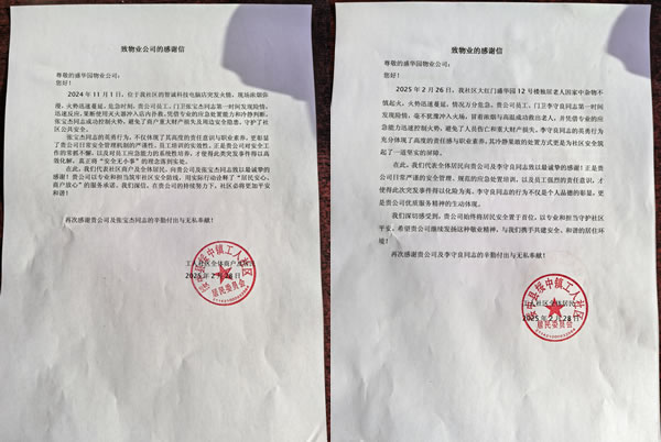 近期,綏中縣盛華園小區(qū)先后發(fā)生兩起火災事故,所幸均被物業(yè)員工及時妥善處理,成功避免了重大人員傷亡和財產(chǎn)損失,綏中鎮(zhèn)工人社區(qū)居委會為此向盛華園物業(yè)公司發(fā)來感謝信,對兩位員工的英勇行為表示高度贊揚。