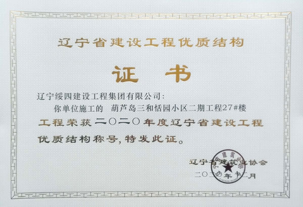 “葫蘆島三和恬園小區(qū)二期工程27#樓”榮獲2020年度遼寧省建設工程優(yōu)質(zhì)結(jié)構(gòu)稱號